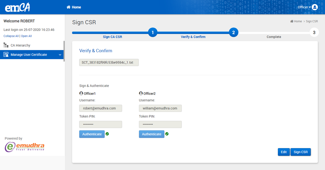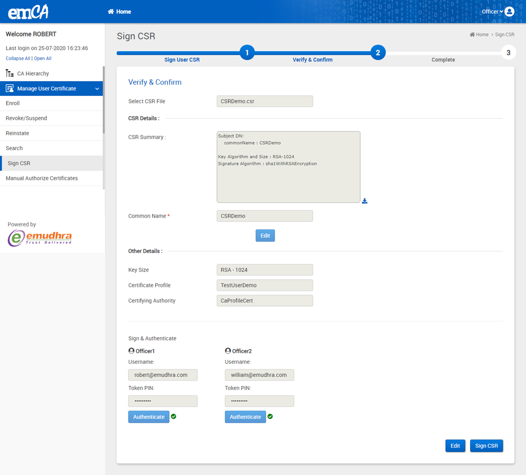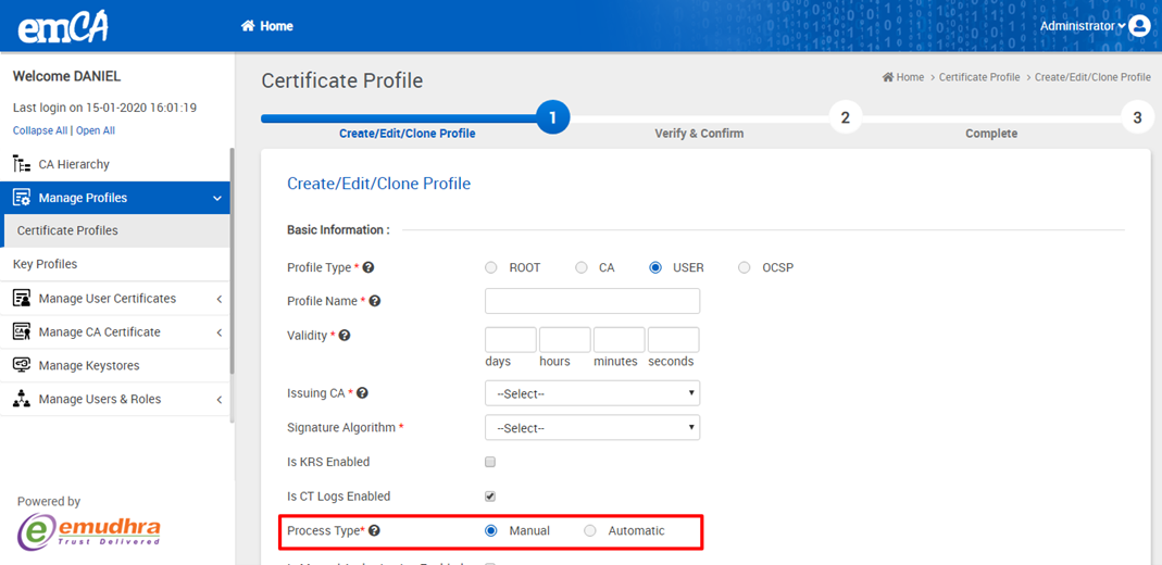 After creation of user profile go to Manage User Certificateà Sign CSR and Sign a .CSR file and select the certificate profile created in the previous step .