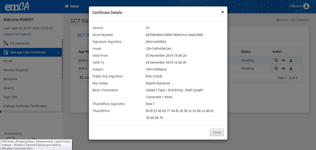 The SCT Request feature, found under Manage User Certificate, is only accessible to officers. If a certificate request is created under the category of CT Logs Enable (as indicated in the user profile), officers have the ability to import the response, view the certificate, and download it.