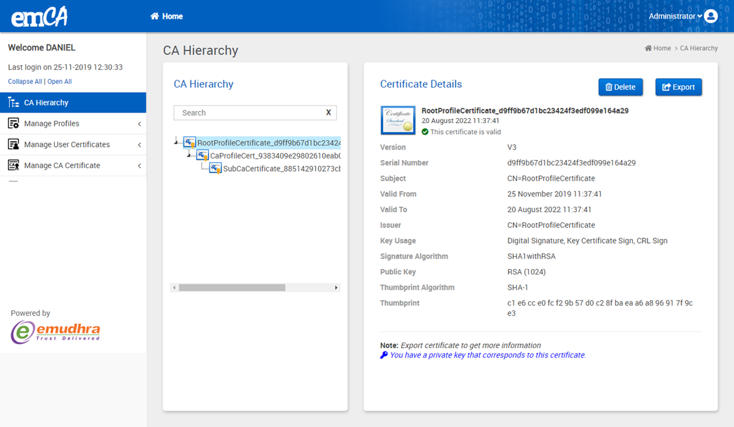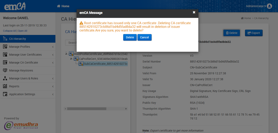 Delete of Root / CA certificates along with key pairs available in HSM or any other device can be done by using this option. This option is available only to administrators.