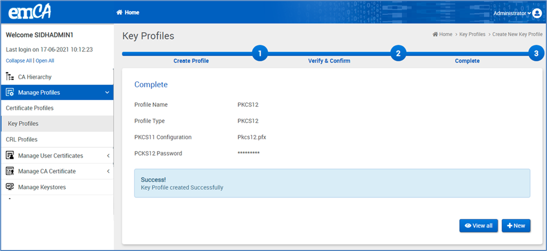 The newly created key profile will be reflected and updated on the "Manage Key Profile" page.