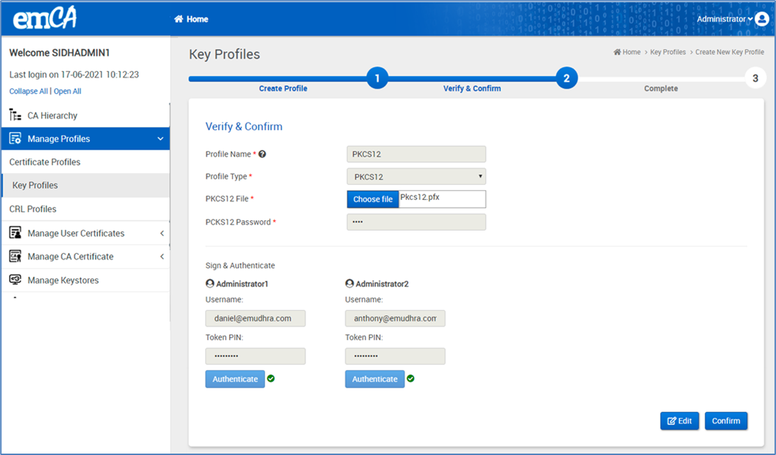 On the Verify & Confirm page, the administrator is required to review the entered data and authenticate by signing in with a valid email ID and token PIN.