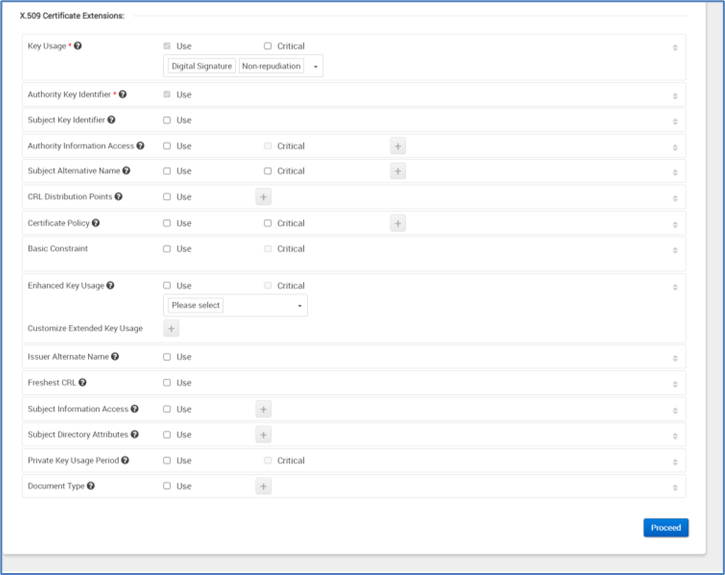 The following are the list of extensions available for selection as part of the ‘X.509 Certificate Extensions’ section. To select a specific extension, select the ‘Use’ checkbox attached to the respective extension. In addition it, for selected extensions, an option to mark a specific section as ‘Critical’ is also provided.                                                                                                                                                                                                                                                                                                                                                                                                                                                                                                                                                                                                                                                                                                                                                                                                                                                                                                                                                                                                                                                                                                                                                                                                                                                                                                                                                                                                                                                                                                                                                                                                                                                                                                                                                                                                                                                                                                                                                                                                                                                                                                                                                                                                                                                                                                                                                                                                                                                                                                                                                                                                                                                                                                                                                                                                                                                                                                                                                                                                                                                                                                                                                                                                                                                                                                                                                                                                                                                                                                                                                                                                                                                                                                                                                                                                                                                                                                                                                                                                                                                                                                                                                                                                                                                                                                                                                                                                                                                                                                                                                                                                                                                                                                                                                                                                                                                                                                                                                                                                                                                                                                                                                                                                                                                                                                                                                                                                                                                                                                                                                                                                                                                                                                                                                                                                                                                                                               