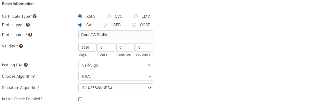 In order to create a root CA OR Sub CA certificate profile, the admin must select the CA Certificate Profile and fill in all mandatory fields in the Certificate Profile Edit Dialog, which contains three sections:&#x20;