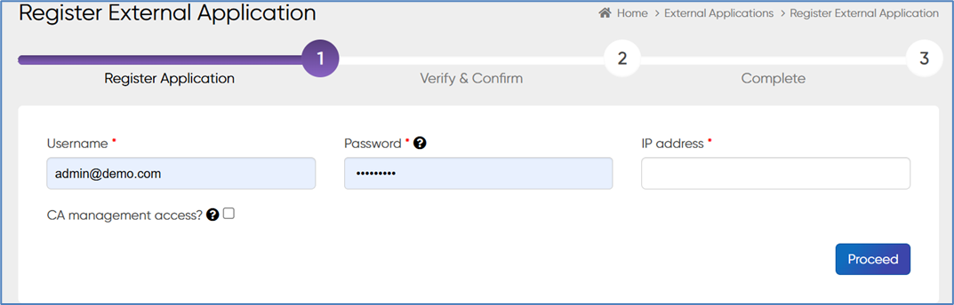 * Enter the IP Address of the new External Application. This address is used to whitelist the new External Application.