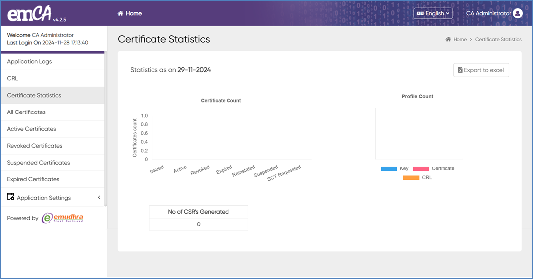 The Certificate Statistics report displays the total number of certificates created or generated through emCA, including Issued, Active, Revoked, Expired, Suspended, and Reinstated certificates for all groups.