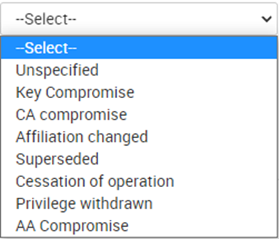 Click on <img src="https://2804668976-files.gitbook.io/~/files/v0/b/gitbook-x-prod.appspot.com/o/spaces%2FOwstGDJbR4yGRTr2aEFp%2Fuploads%2FfCrVSQsvUI2v6jGXITT9%2Fimage.png?alt=media&#x26;token=7befcfc1-caf4-4b4e-afe9-f2f054927d24" alt="" data-size="line">  in order to start the revocation process for the selected CA certificate.