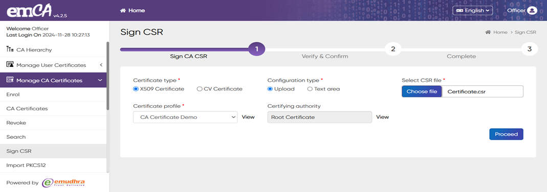 An Officer can use the following UI in order to sign CA CSR from External CAs using existing CAs and certificate profiles from the EmCA Application.