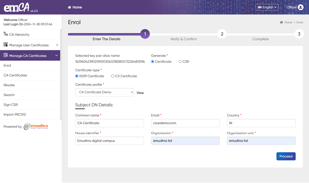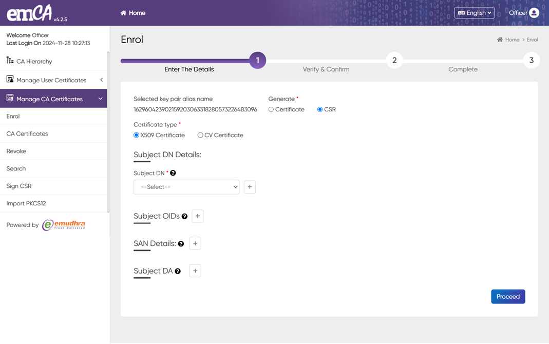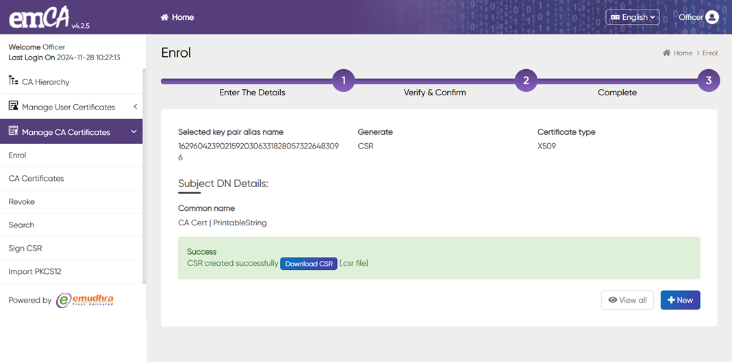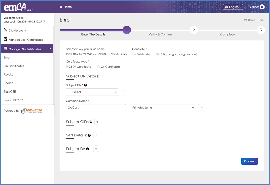An officer can enroll new CAs through the following UIs. The enrollment process involves generating a new CA key and a new CA certificate/CSR using that key.