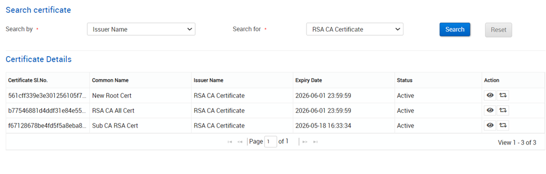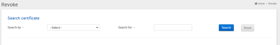 To search for certificate information, you can enter search criteria in the appropriate fields. For all search criteria except the Issuer Name, you can enter the desired search value in the right field. However, when you search using the Issuer Name, the right field changes to a dropdown box. From this dropdown, you can select the name of any existing Certificate Authority (CA).&#x20;