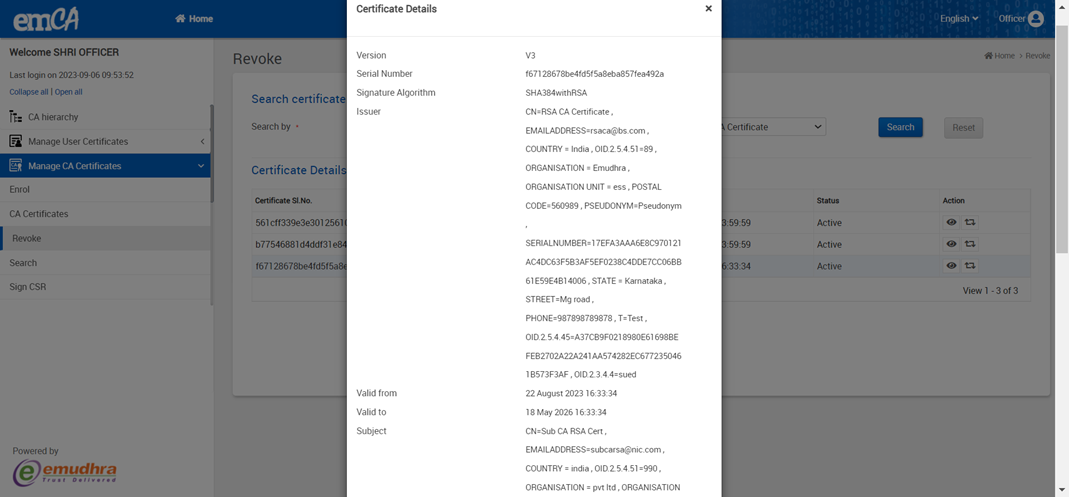 An Officer can revoke CA certificates in his/her own group manually, if necessary, using this UI.