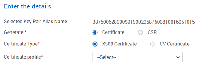 Users can select between two certificate types: X509 and CV certificate, using radio buttons.