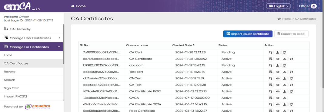 An Officer can manage the CA certificates in his/her own group using the following UI.
