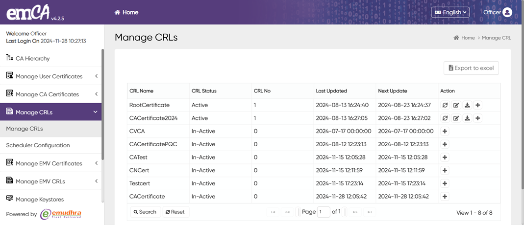 An officer can create Certificate Revocation Lists (CRLs) for all CAs in their group, configure automatic renewal for each CRL, and download the current CRL from the UI.