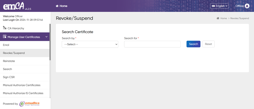 An Officer can revoke or suspend user certificates of his/her group manually, if necessary, using this UI.