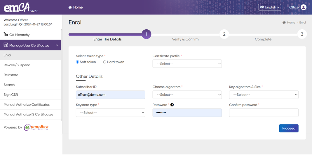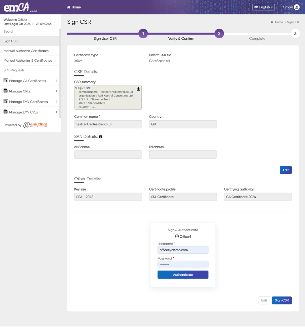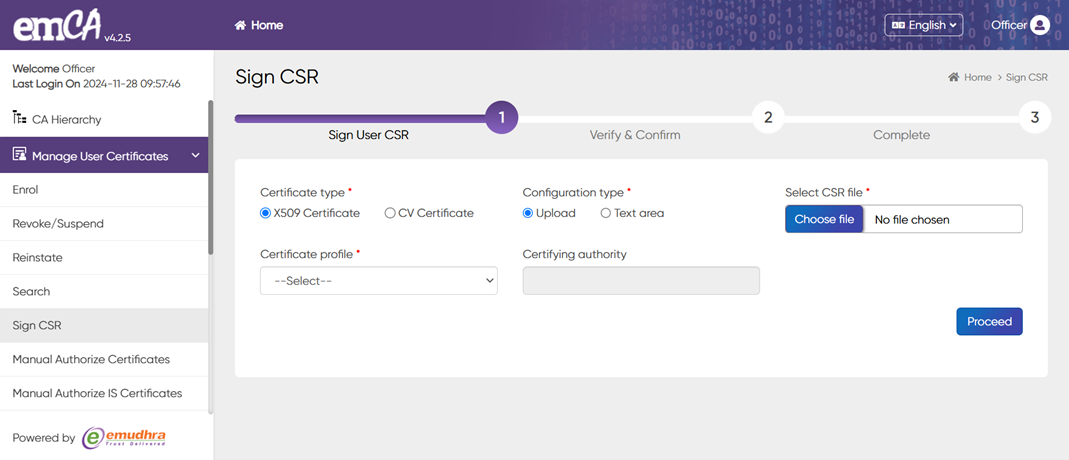 Officers can generate user certificates based on a Certificate Signing Request (CSR) manually using the following UI.