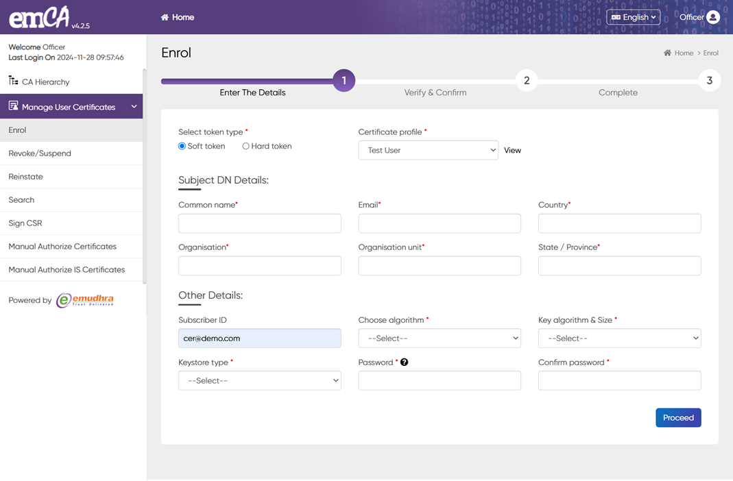An Officer can choose from all certificate profiles available in his/her group. Depending on the certificate profile additional insert fields will be loaded in. The following image is an example of a Soft Token UI: