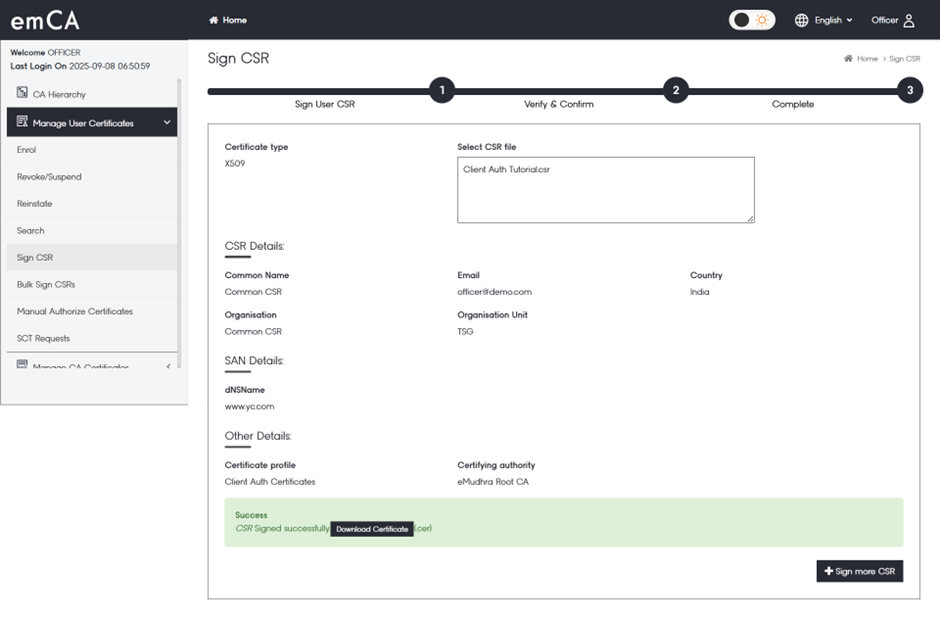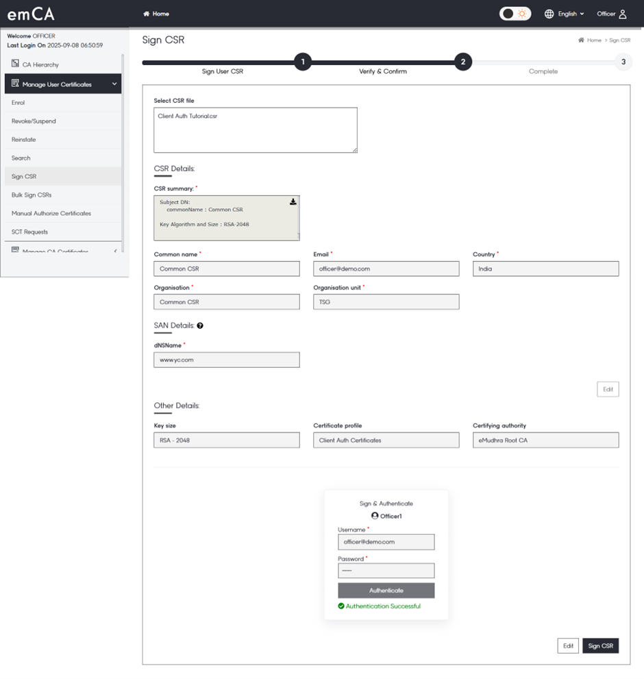 Officer can use the Client Auth Certificate Profile created by Administrator to create and issue the Client Auth Certificates or Sign CSR for Client Auth Certificates as a CA. This section covers both.