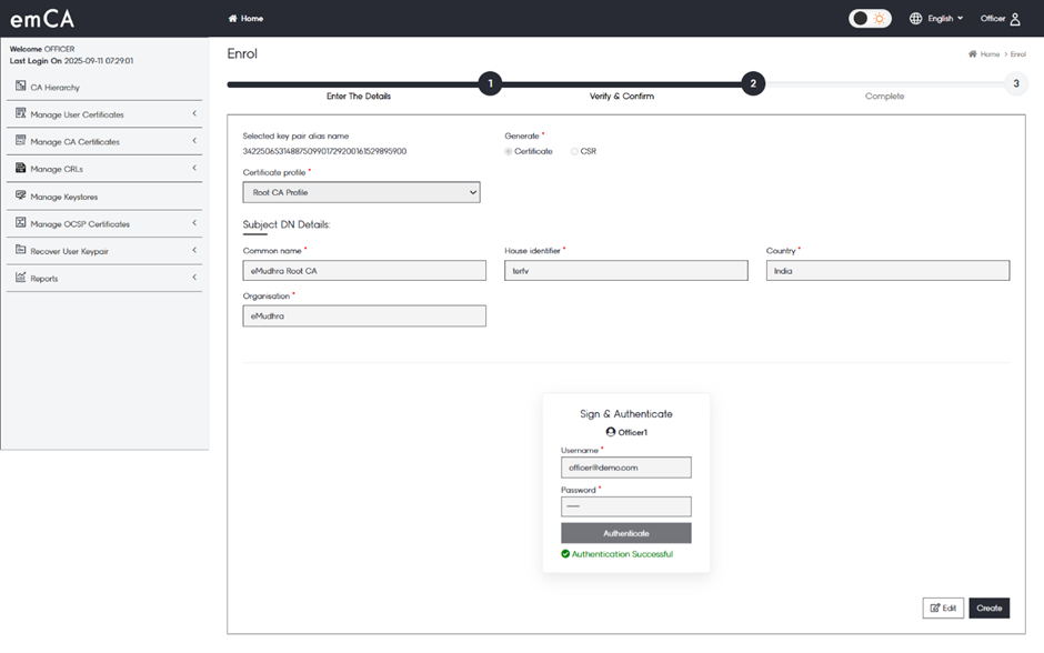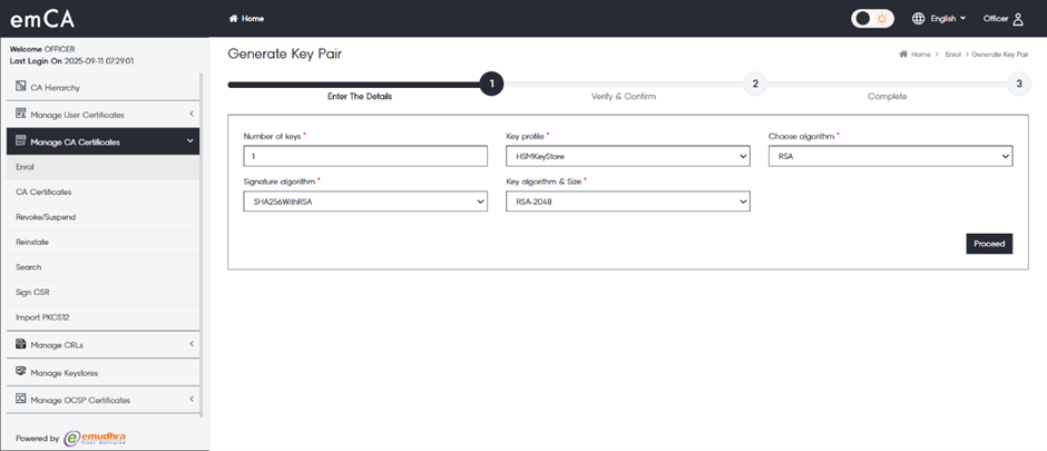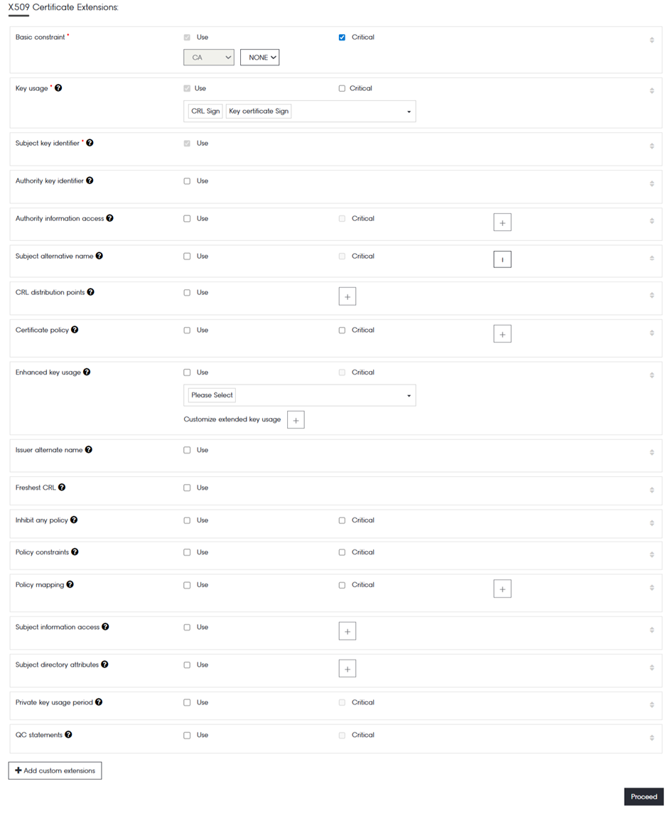 6. Click on “Proceed” once the selection of DN details and X509 Certificate Extensions are completed.