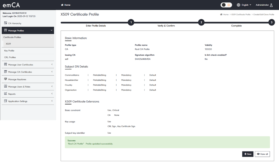 5. Click on “View all” to see all the issued CA certificates or “New” to create a new certificate with the key pair and CA certificate Profile.