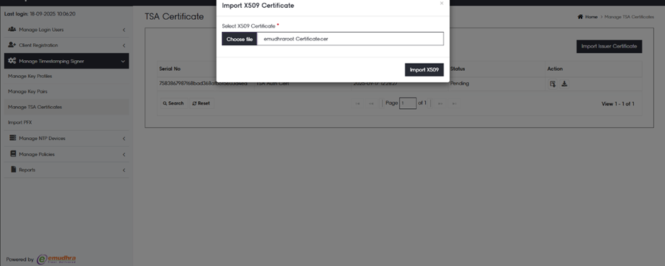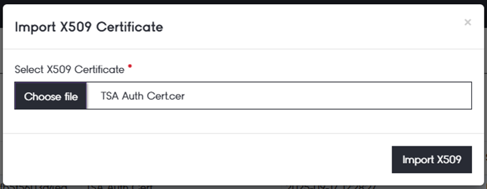 Click the **Import** action for the TSA Auth Certificate and upload the signed TSA certificate.\