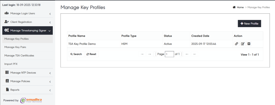 Navigate to **Manage Timestamping Signer → Manage Key Profile → New Profile**.